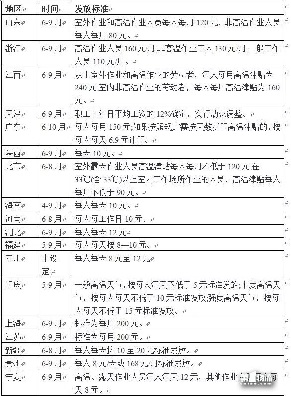 按照人社部的要求,各地根據自己的實際情況,出臺了各自的高溫補貼發放標準。