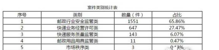 按照郵政市場行政處罰案件類別統計,各類案件數量依次為:郵政行業安全監管類1551件,快遞業務經營許可類647件,快遞服務質量監管類143件,郵政用品用具監管類11件,市場秩序類3件。