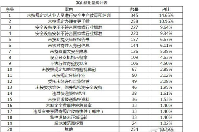 按照案由使用次數統計,郵政市場案件中排名前十的違法行為分別是:未按規定對從業人員進行安全生產教育和培訓(345件,占比14.65%),未按規定辦理變更手續(258件,占比10.96%),安全設備使用不符合國家或行業標準(227件,占比9.64%),安全設備安裝不符合國家或行業標準(220件,占比9.34%),未按期提交年度報告書(157件,占比6.67%),未核對寄件人身份信息(144件,占比6.11%),未整改重大安全隱患(126件,占比5.35%),設立分支機構未備案(109件,占比4.63%),不執行收寄驗視制度(106件,占比4.50%),未按照規定加蓋收寄驗視戳記(67件,占比2.85%)。具體情況見下表。