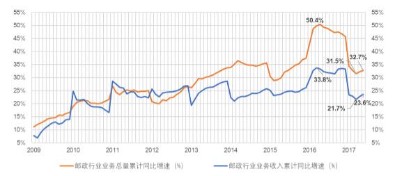 上半年,郵政全行業(yè)完成業(yè)務(wù)總量4297.6億元,同比增長32.7%,實(shí)現(xiàn)業(yè)務(wù)收入3060.3億元,同比增長23.6%。6月當(dāng)月,全行業(yè)業(yè)務(wù)總量同比增長34.6%,全行業(yè)業(yè)務(wù)收入同比增長27.6%,分別較4月份提升1.2和1.9個(gè)百分點(diǎn)。