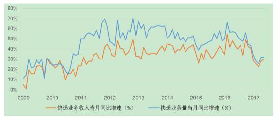 圖2 快遞業(yè)務(wù)量和業(yè)務(wù)收入當(dāng)月同比增速變化情況