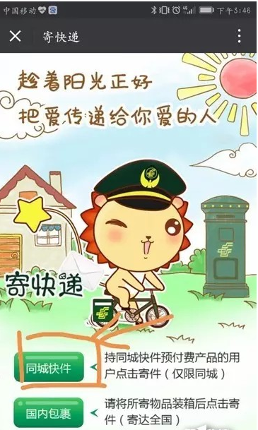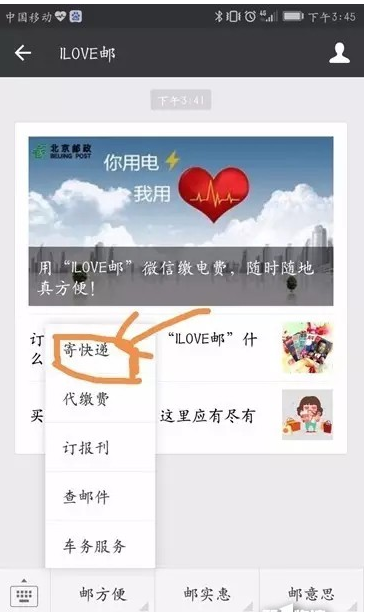 操作上與信筒快件業(yè)務類似,先提前備好快遞包裝袋或者包裝紙箱。然后用北京郵政微信官方服務號“ILOVE郵”,選擇寄快遞。