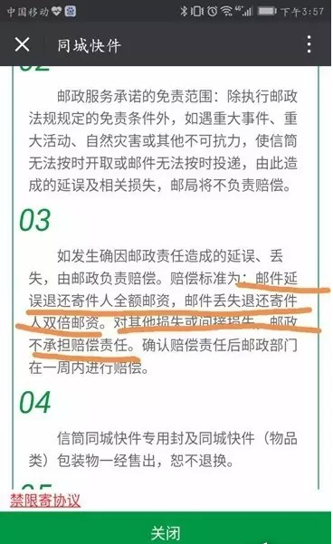 根據(jù)服務條款:“如果發(fā)生確因郵政責任造成的延誤、丟失,由郵政負責賠償。”