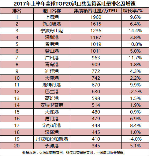 2017年上半年全球TOP20集裝箱港口排名 中國(guó)港增速最高