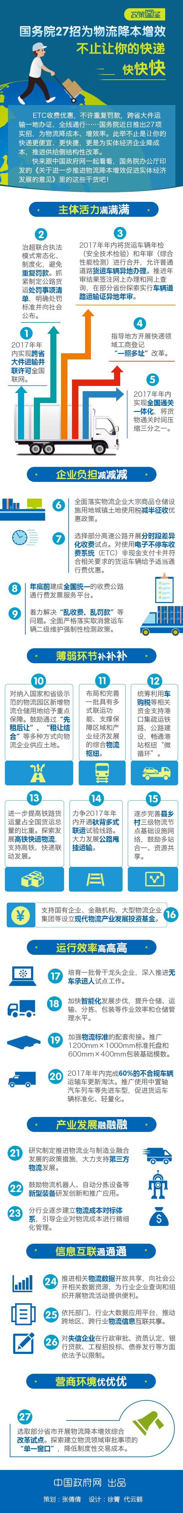 ETC收費優惠,不許重復罰款,跨省大件運輸一地辦證、全線通行……國務院近日推出27項實招,為物流降成本、增效率。此舉不止是讓你的快遞更便宜、更快捷,更是為實體經濟企業降成本,推進供給側結構性改革。