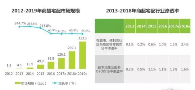隨著商超宅配的興起和發展,即時物流在外賣配送之外找到了新的市場增長點。目前商超宅配O2O行業滲透率較低,不足2%,但保持50%以上的年增長率,成為即時物流新的增長點。另外,“新零售”概念的提出,將通過數據和商業邏輯的深度結合,實現消費模式的深刻變革,其中物流的價值和重要性日益凸顯。
