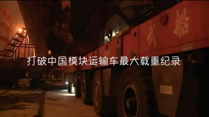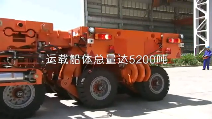 130軸線自行式模塊運輸車,長達128米、車輪520只,由10個車組進行聯動作業,運載船體總量達5200噸,刷新此前國內120軸線6個車組的最高運輸紀錄。