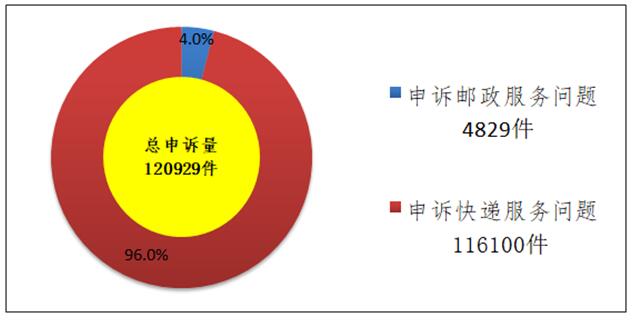 2017年8月,國家郵政局和各省(區、市)郵政管理局通過“12305”郵政行業消費者申訴電話和申訴網站共受理消費者申訴120929件。申訴中涉及郵政服務問題的4829件,占總申訴量的4.0%;涉及快遞服務問題的116100件,占總申訴量的96.0%。