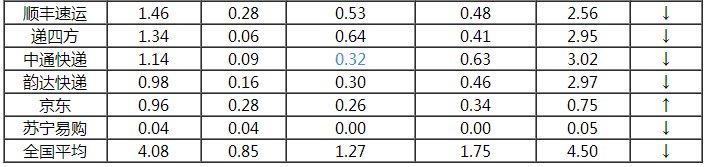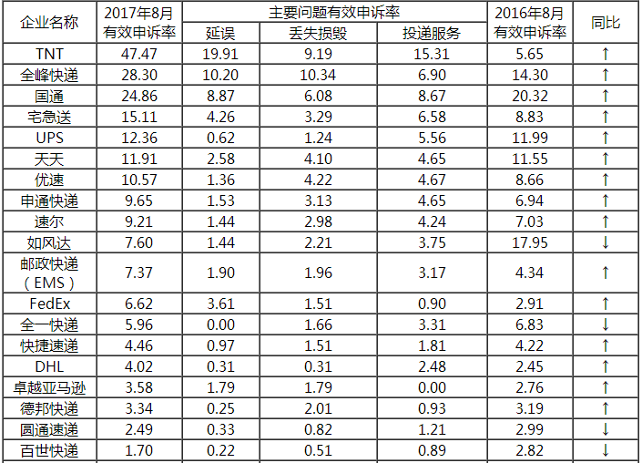 2017年8月,消費者對43家快遞企業進行了有效申訴,全國快遞服務有效申訴率為百萬分之4.08,環比減少0.51,同比減少0.42,高于全國平均有效申訴率的快遞企業有14家。全國快遞服務快件投遞服務的有效申訴率為百萬分之1.75,同比減少0.19;快件丟失損毀的有效申訴率為百萬分之1.27,同比減少0.13;快件延誤的有效申訴率為百萬分之0.85,同比減少0.01。