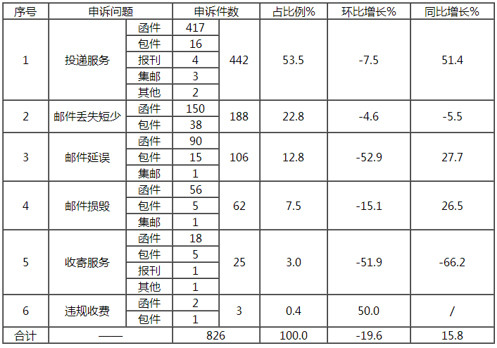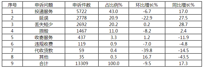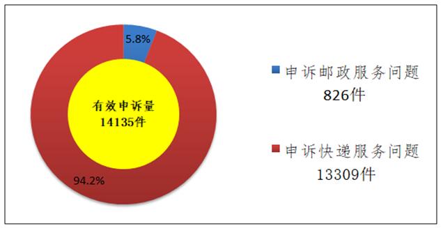受理的申訴中有效申訴(確定企業責任的)為14135件,比上年同期增長17.2%。有效申訴中涉及郵政服務問題的826件,占有效申訴量的5.8%;涉及快遞服務問題的13309件,占有效申訴量的94.2%。
