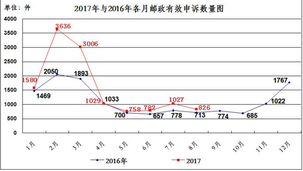 2017年8月,消費者關于郵政服務問題的有效申訴826件,環比下降19.6%,同比增長15.8%。