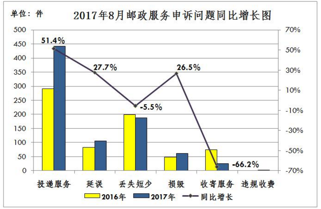 2017年8月,消費者對郵政服務申訴的主要問題與上月相比有所下降。與去年同期相比,郵政服務主要問題增長的有投遞服務、郵件延誤和郵件損毀,同比分別增長51.4%、27.7%和26.5%。