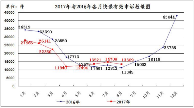 2017年8月,消費者關于快遞服務的有效申訴13309件,環比下降9.5%,同比增長17.3%。