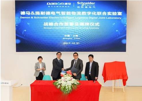 中國上海,2017年11月3日 —— 日前,全球能效管理與自動化領域數字化轉型的領導者施耐德電氣攜手中國物流裝備領軍企業德馬集團,共同宣布設立德馬-施耐德電氣物流數字化聯合實驗室,在業內首創了強強聯合探索物流數字化轉型的創新協作模式。德馬集團董事長兼總裁卓序先生和施耐德電氣工業事業部副總裁、OEM中國區業務負責人龐邢健先生共同出席了在CeMAT ASIA 2017物流展現場舉辦的合作揭牌儀式,標志著雙方的戰略合作正式邁入了一個更深入的階段。