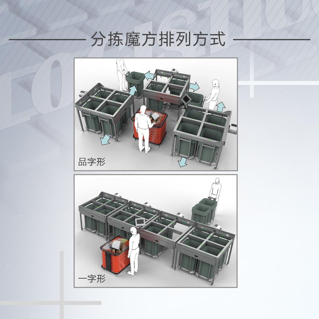 分揀魔方,名副其實好似一只百變魔方,采用了大容量、可拼接、可靈活移動的格口設計,用戶可以根據不同的場地、使用場景和習慣來進行排布。無論是品字排布、還是一字排布,分揀魔方均能夠輕松滿足用戶使用需求。