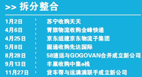 龐大的市場從不缺少整合重組與投資控股的案例,物流行業也不例外。蘇寧為提速社會化收購了天天快遞;圓通收購先達國際布局海外市場;58速運與GOGOVAN合并成立新公司,打通國內與海外的同城貨運市場;中集e棧并入到豐巢正在改變快遞柜行業的格局;貨車幫與運滿滿戰略合并,城際整車貨運市場格局的現狀被打破。謀求社會化發展、拓展海外市場、提升網點密度,物流企業一直謀求綜合發展、尋求新的利潤增長空間接連發力。無論是資本的推動運作,還是企業發展的需求,整合兼并成為物流行業發展的代名詞之一。