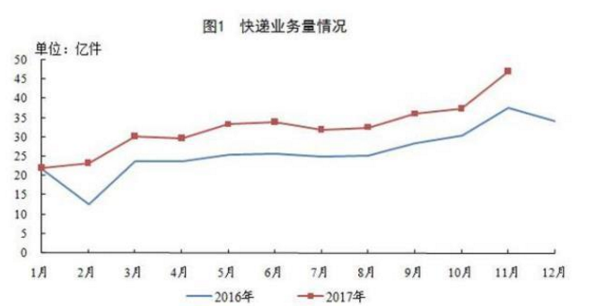 不過(guò),從1-11月的整體數(shù)據(jù)來(lái)看,快遞的業(yè)務(wù)量增速維持在25%的增長(zhǎng)率,也并不低,快遞行業(yè)仍處于較快速發(fā)展時(shí)期,截至11月30日,全國(guó)快遞業(yè)務(wù)量已累計(jì)完成358.6億件,距離400億不到50億件。12月快遞業(yè)務(wù)量的增速如果保持在同比增長(zhǎng)22%上下,那么2017年全年的業(yè)務(wù)量還是很可能突破400億大關(guān),繼續(xù)保持每年增長(zhǎng)100億的水平。