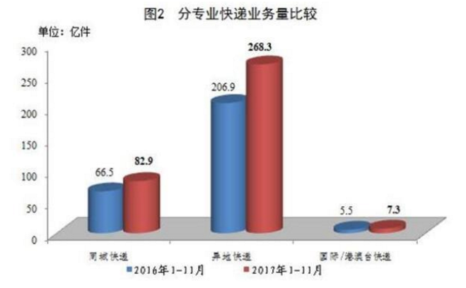 此外,從地域上來(lái)看,1-11月,東、中、西部地區(qū)快遞業(yè)務(wù)量比重分別為81.1%、11.6%和7.3%,業(yè)務(wù)收入比重分別為80.9%、10.8%和8.3%。