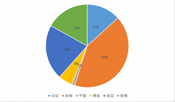 媒體分類上,新聞類傳播占比最高,占總傳播量的42%,其次是微信和微博分別占傳播量的21%和17%,論壇、博客、平媒則分別占總傳播量的13%,6%,1%。