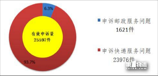 受理的申訴中有效申訴(確定企業(yè)責(zé)任的)為25597件,比上年同期增長(zhǎng)3.2%。有效申訴中涉及郵政服務(wù)問(wèn)題的1621件,占有效申訴量的6.3%;涉及快遞服務(wù)問(wèn)題的23976件,占有效申訴量的93.7%。