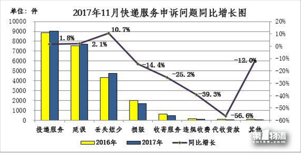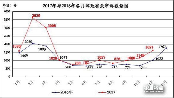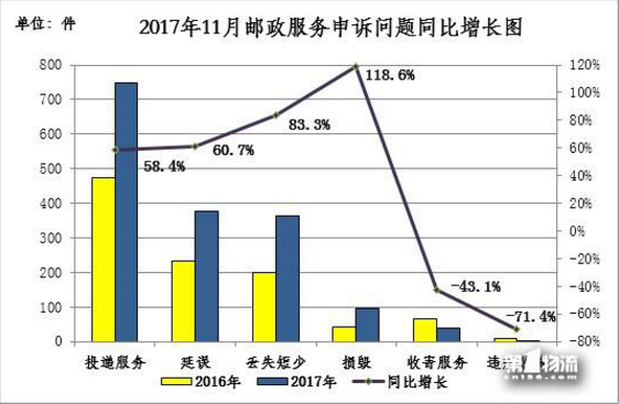 2017年11月,消費(fèi)者關(guān)于郵政服務(wù)問(wèn)題的有效申訴1621件,環(huán)比增長(zhǎng)41.1%,同比增長(zhǎng)58.6%。