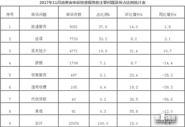 2017年11月,消費(fèi)者關(guān)于快遞服務(wù)的有效申訴23976件,環(huán)比增長(zhǎng)15.0%,同比增長(zhǎng)0.8%。