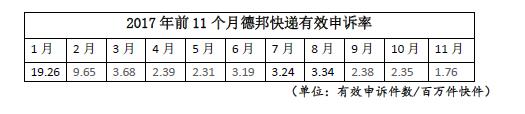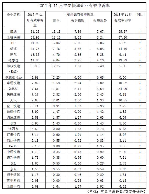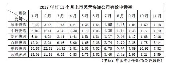 而以優(yōu)質(zhì)服務(wù)而備受市場(chǎng)青睞的順豐速運(yùn),長(zhǎng)期處于申訴榜單“下游”,11月的有效申訴率僅為1.18。其它上市的民營(yíng)快遞公司,中通快遞的有效申訴率也在2以內(nèi),韻達(dá)快遞和百世快遞的有效申訴率分別為2.16和3.14。