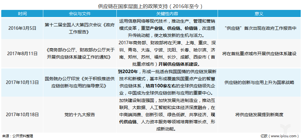 近年來,供應鏈逐步受到了國家政府層面的支持。首先,2016年李克強總理做的政府工作報告中,首次提及“重塑產(chǎn)業(yè)鏈、供應鏈、價值鏈”。此后,李克強總理多次在公開場合講話中提到該內(nèi)容。