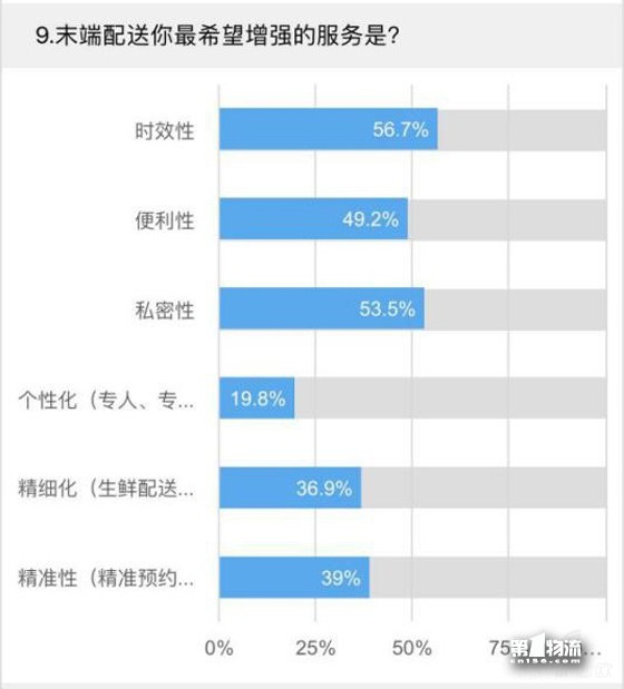 “末端配送你最希望增強的服務是什么?”有接近40%的受訪者表達了對精準性(精確預約時間、夜間配等)和精細化(生鮮)的配送需求。