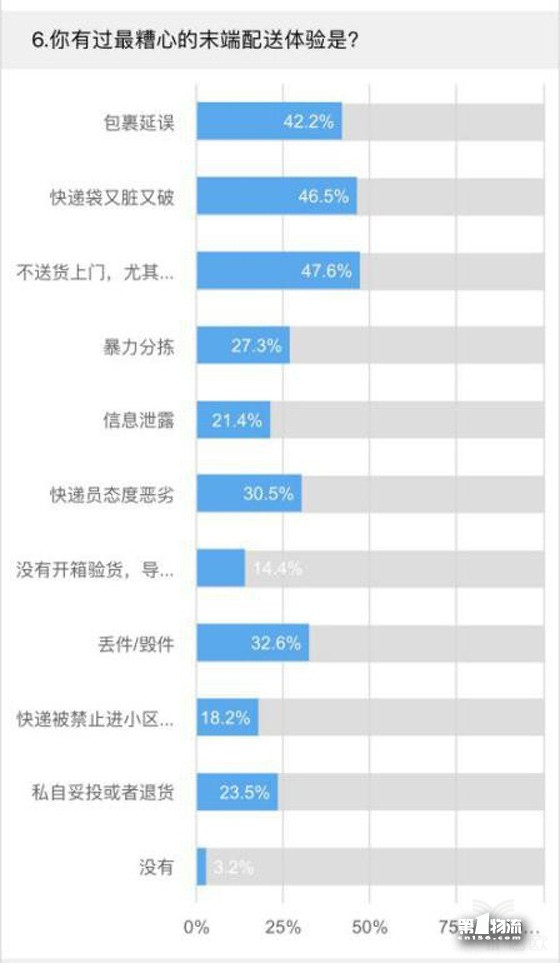 “最糟心的末端配送體驗”中,投票最高的是“不送貨上門,尤其是重物”;其次是“快遞袋又臟又破”,再其次才是“包裹延誤”。