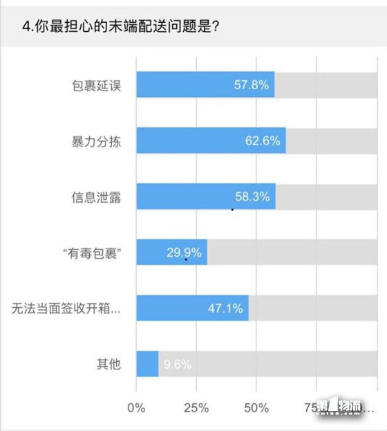 “你最擔心的末端配送問題是?”調研顯示,消費者對“暴力分揀”和“信息泄露”的擔憂,超過了“包裹延誤”。