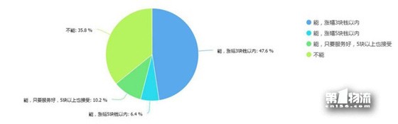 而為了享受更好的服務,64%的受訪者表示可以接受快遞漲價。其中,47.6%的受訪者能接受3塊錢以內的漲幅;6.4%的消費者能接受5塊錢以內的漲幅;還有10.2%的消費者表示,只要服務好,漲幅5塊錢以上也接受。
