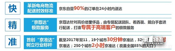 京東物流則正在形成包括211限時達、夜間配、極速達(2小時送達)、京準達(最高精確到30分鐘)、京尊達、生鮮品全程溫控可視在內的階梯式、個性化的行業標準。