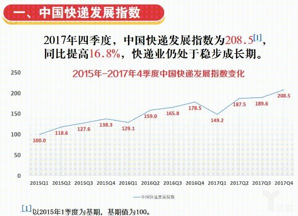 2017年四季度,中國快遞發展指數為208.5,同比提高16.8%,快遞業仍處于穩步成長期,呈現出發展態勢高位運行,市場結構持續優化,資源要素加速集聚,網絡穩步向下延伸,服務能力顯著增強的特點,較好地應對了旺季快遞服務需求,快遞準公共服務屬性凸顯。據國家郵政局發展研究中心市場監管研究處負責人耿艷介紹,2018年中國快遞發展指數將調整優化指標體系,加大發布頻次,月度快遞發展指數將于2月初首次與公眾見面。