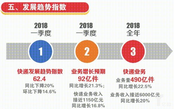 此外,受春節預期因素影響,快遞發展趨勢指數為62.4,同比下降20%,環比下降14.6%。在業務增長預期方面,預計2018年一季度業務量將達到92億件,同比增長21.3%;快遞業務收入將接近1150億元,同比增長16.8%。預計全年完成快遞業務量490億件,同比增長22.5%;全年快遞業務收入接近6000億元,同比增長20%。