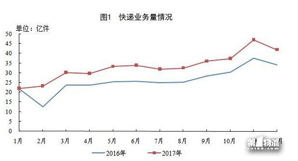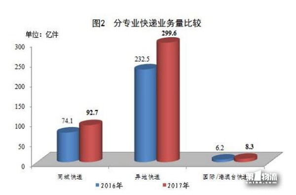 2017年,全國快遞服務企業業務量累計完成400.6億件,同比增長28%;業務收入累計完成4957.1億元,同比增長24.7%。其中,同城業務量累計完成92.7億件,同比增長25%;異地業務量累計完成299.6億件,同比增長28.9%;國際/港澳臺業務量累計完成8.3億件,同比增長33.8%。