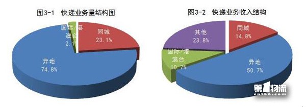 2017年,同城、異地、國際/港澳臺快遞業務量分別占全部快遞業務量的23.1%、74.8%和2.1%;業務收入分別占全部快遞收入的14.8%、50.7%和10.7%。與去年同期相比,同城快遞業務量的比重下降0.6個百分點,異地快遞業務量的比重上升0.5個百分點,國際/港澳臺業務量的比重上升0.1個百分點。