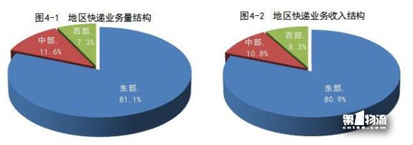 2017年,東、中、西部地區快遞業務量比重分別為81.1%、11.6%和7.3%,業務收入比重分別為80.9%、10.8%和8.3%。與去年同期相比,東部地區快遞業務量比重上升0.2個百分點, 快遞業務收入比重下降0.2個百分點;中部地區快遞業務量比重下降0.3個百分點, 快遞業務收入比重上升0.1個百分點;西部地區快遞業務量比重上升0.1個百分點,快遞業務收入比重上升0.1個百分點。