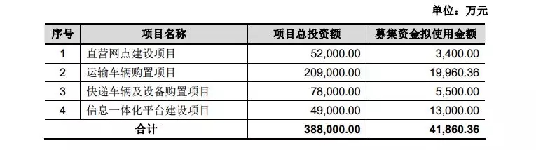 2018年1月發布的《招股說明書》顯示,擬公開發行不超過1億股A股,占發行后公司總股本的比例約為10.42%,計劃募集資金41860.36萬元,擬分別投入直營網點建設、運輸車輛購置、快遞車輛與設備購置和物流信息一體化平臺項目。