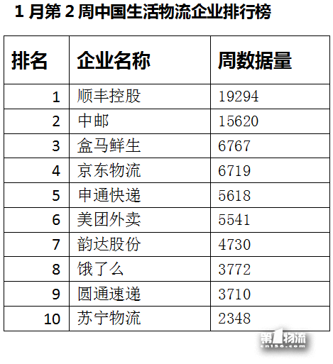 1月第2周中國生活物流企業排行榜