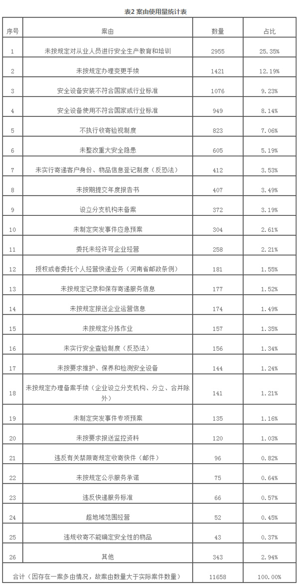 按照案由使用次數統計,郵政市場案件中排名前十的違法行為分別是:未按規定對從業人員進行安全生產教育和培訓(2955件,占比25.35%),未按規定辦理變更手續(1421件,占比12.19%),安全設備安裝不符合國家或行業標準(1076件,占比9.23%),安全設備使用不符合國家或行業標準(949件,占比8.14%),不執行收寄驗視制度(823件,占比7.06%),未整改重大安全隱患(605件,占比5.19%),未實行寄遞客戶身份、物品信息登記制度(412件,占比3.53%),未按期提交年度報告書(407件,占比3.49%),設立分支機構未備案(373件,占比3.19%),未制定突發事件應急預案(304件,占比2.61%)。具體情況見表2。