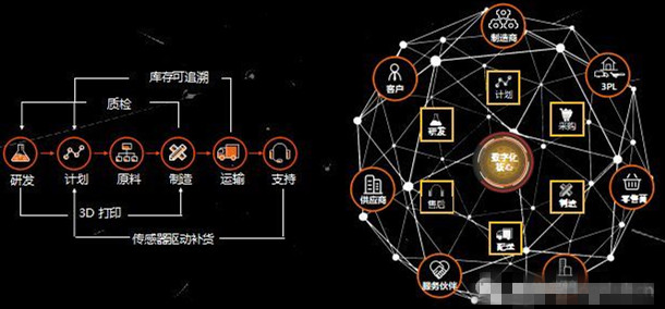 我們可以看到,左邊是傳統供應鏈企業的信息流轉方式,物流的信息在不同部門的傳遞是一種線性的,在未來整個企業信息化的數字化核心和構建,在不同的部門之間要把信息化轉化為網絡化和驅動性化,但是以數字為核心,減少了不同周邊節點。