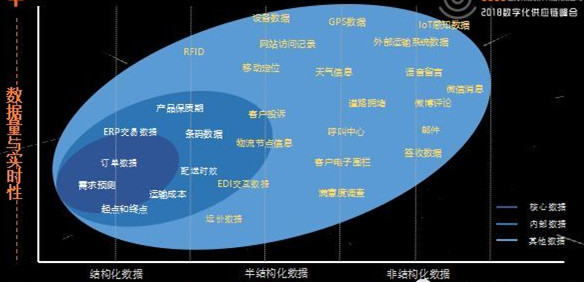 數字化供應鏈的核心是數據量,IDC與EMC報告預測2020年的數據量預測達40000EB,細化到具體每個人,相當于一個人擁有相當于5200GB的數量。具體到物流和供應鏈來講,與傳統不同的是,數字化供應鏈數據的多樣性和規模,及時性相對比較高,物流處理有更多外部的數據等。