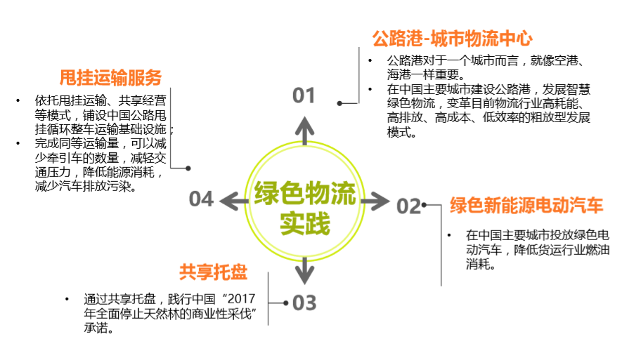 在中國主要城市投放綠色電動汽車,降低貨運行業燃油消耗;2018-2022年每年增加20000臺,每年減少碳排放28.4萬噸;