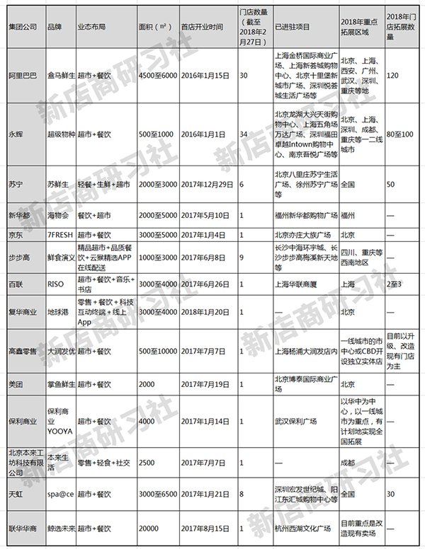 而步步高鮮食演義達18家、天虹sp@ce達8家、蘇寧蘇鮮生達6家、新華都海物會、百聯RISO、大潤發優鮮、美團掌魚生鮮、世紀聯華鯨選以及京東7FRESH各1家。