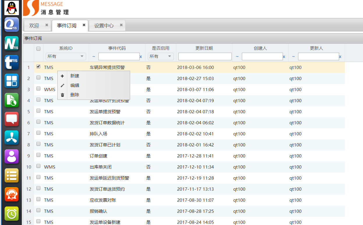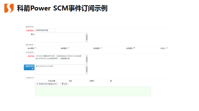 每家企業租戶需要監控與預警的事件各不相同,科箭基于多年的行業積累及最佳實踐,對物流執行各環節進行了細致的流程節點劃分,對每個流程節點預置了事件場景,如發貨通知、車輛異常提貨預警、排隊入場提醒、發運單延遲到貨預警、庫齡告警、安全庫存告警等。用戶可選擇預置訂閱事件進行編輯,也可以完全根據自己企業的需求新建訂閱事件。