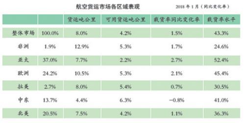 國際航空運輸協(xié)會最新發(fā)布的全球航空貨運定期數(shù)據(jù)顯示,2018年1月,全球航空貨運需求(按照貨運噸公里計算)同比增長8.0%,與2017年12月份增長率(5.8%)相比有所提高。2018年1月份,貨運運力(按照可用貨運噸公里計算)同比增長4.2%。