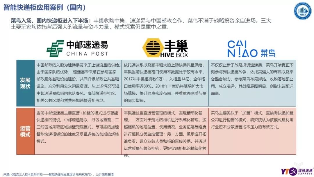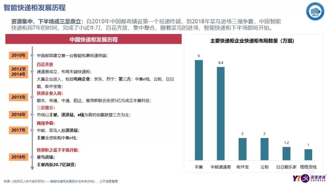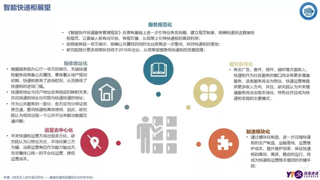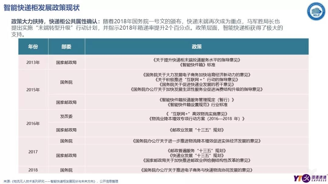 不論是國務院辦公廳2018年一號文《國務院辦公廳關于推進電子商務與快遞物流協同發展的意見》,還是馬軍勝局長提出的“末端轉型升級”行動計劃,無一不是劍指末端配送,企業如何提供更優質、更高效的民生寄遞服務。作為當前最熱門的末端解決方案之一,智能快遞柜自然成為了關注的重點。