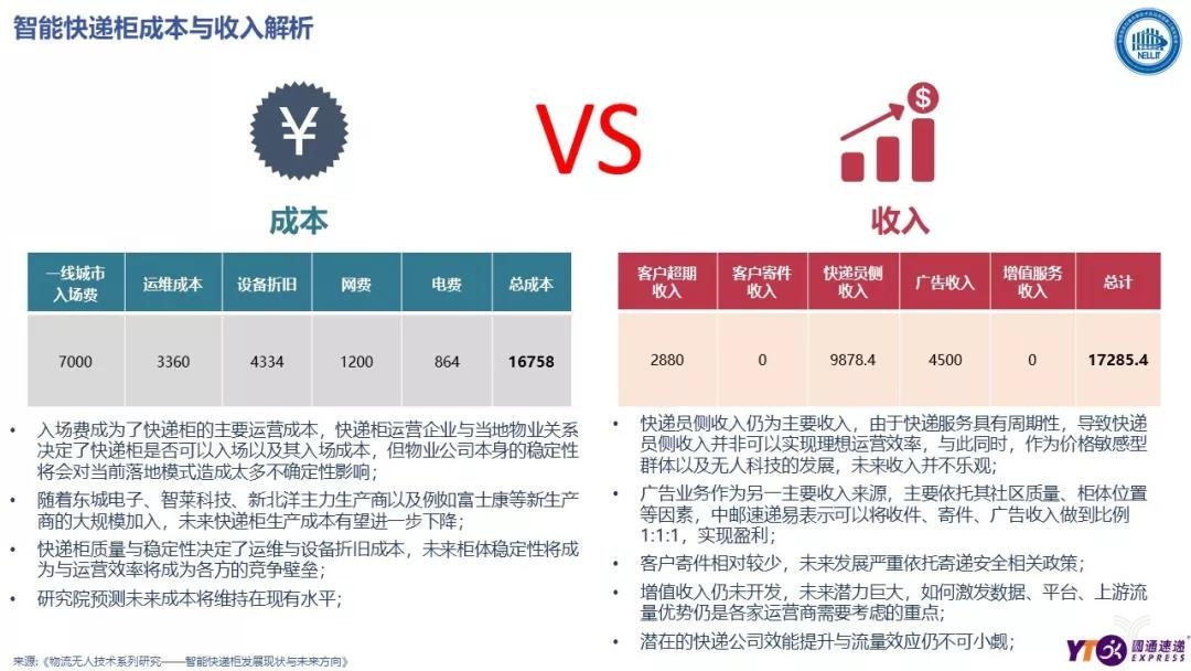 因此, 國家工程實驗室聯合圓通研究院發布了繼《無人機現在與未來——前景解析與快遞物流業應用》后第二份無人科技行業趨勢報告——《智能快遞柜發展現狀與未來方向》,并針對當前智能快遞柜的市場現狀、成本收益、未來發展做出了研判,指出智能快遞柜市場未來數年內仍有巨大市場空間,并提出當前未來智能快遞柜發展將服務規范化、箱體地址化、運營去中心化,盈利多樣化、制造模塊化五大趨勢,為智能快遞柜的發展提供了一些新的思路。