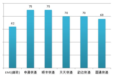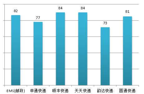 本次調查同時對知名度和美譽度進行了測評。其中知名度是依據顧客對品牌的知曉程度指標評價結果計算得出,美譽度是依據顧客對品牌的偏好、信任和認同程度指標評價結果計算得出??爝f行業6個主要品牌的知名度與美譽度調查結果如圖2和圖3所示。其中,知名度較高的是申通快遞和順豐快遞,均為75分;美譽度較高的是順豐快遞和天天快遞,均為84分;其次是EMS(郵政)82分。